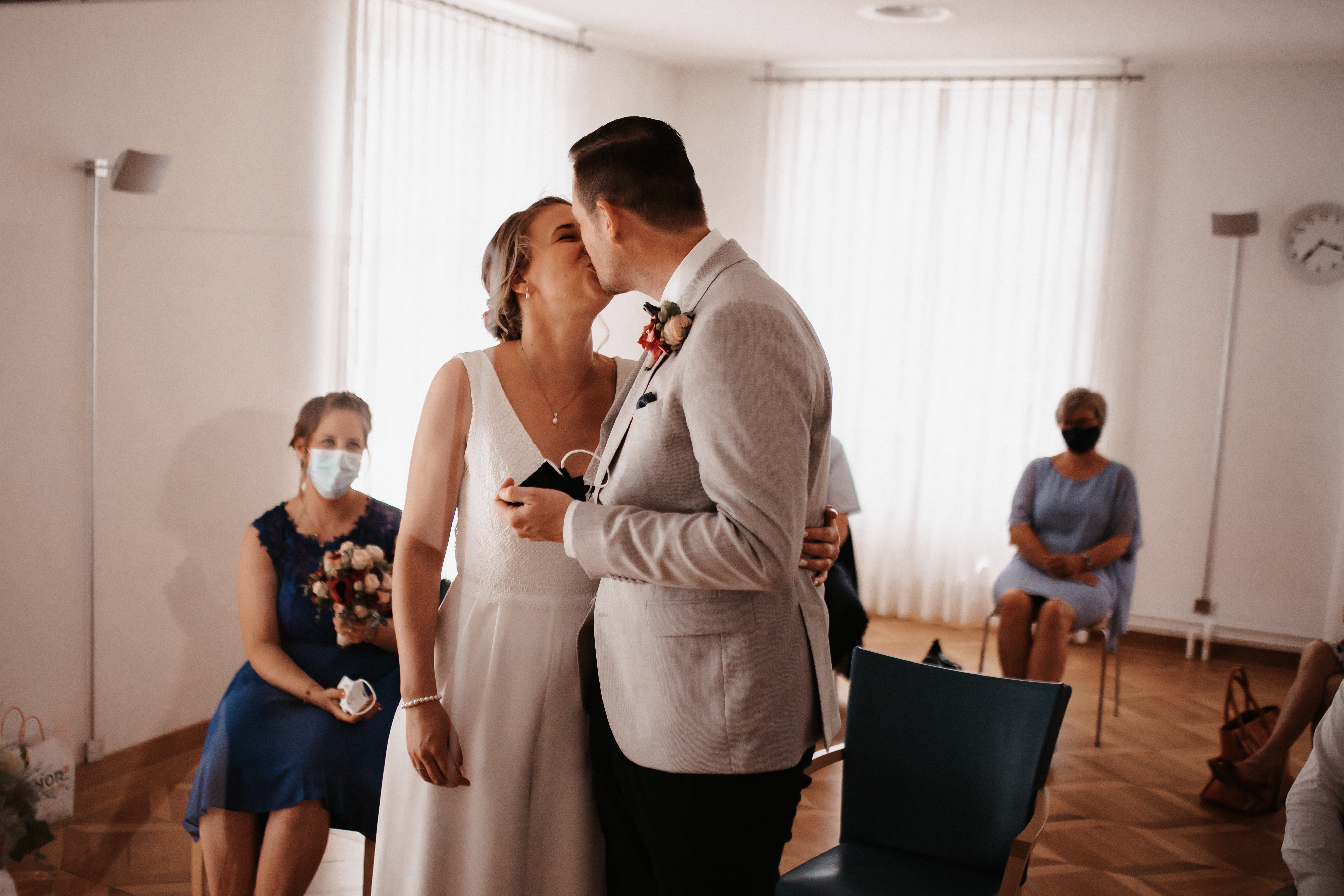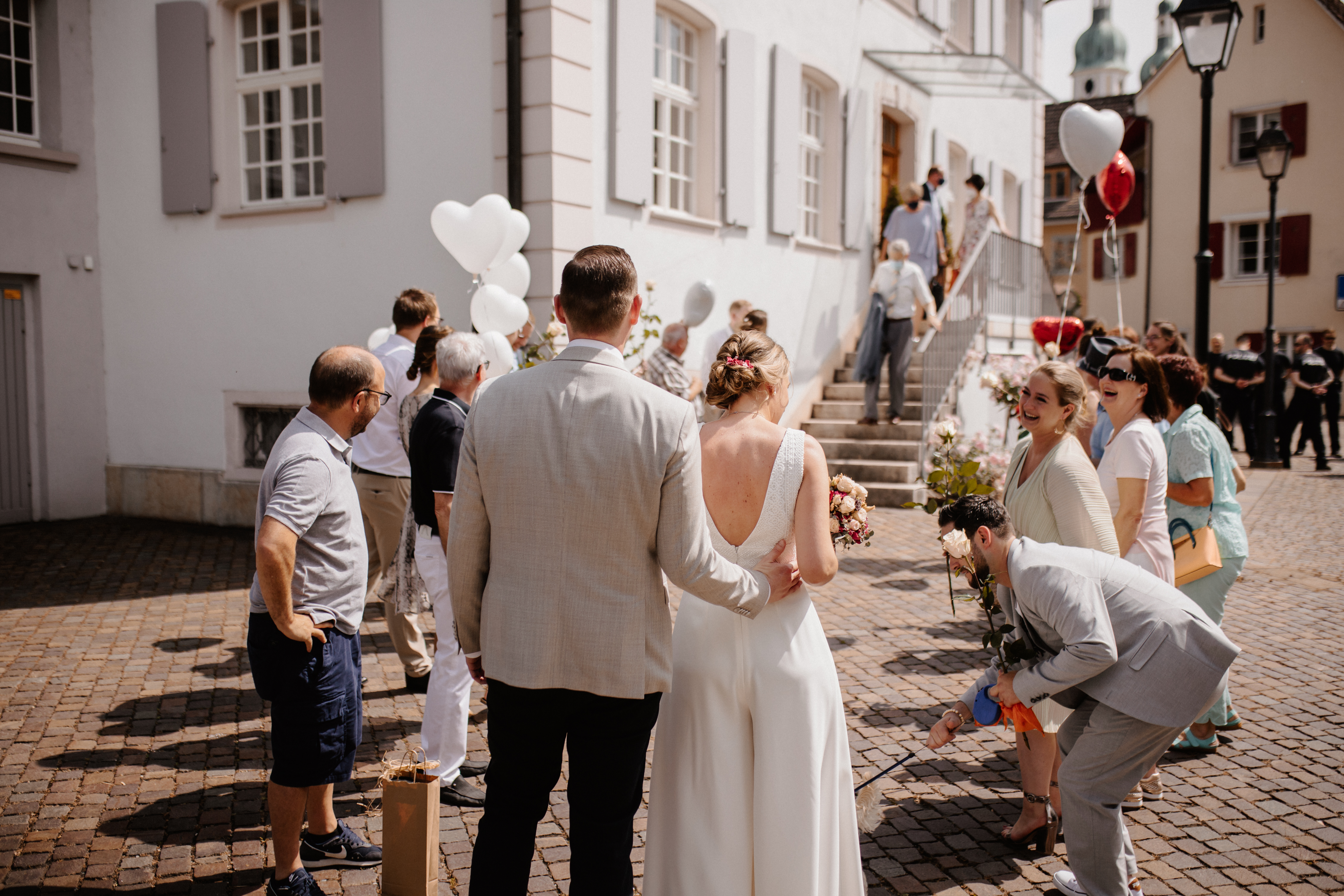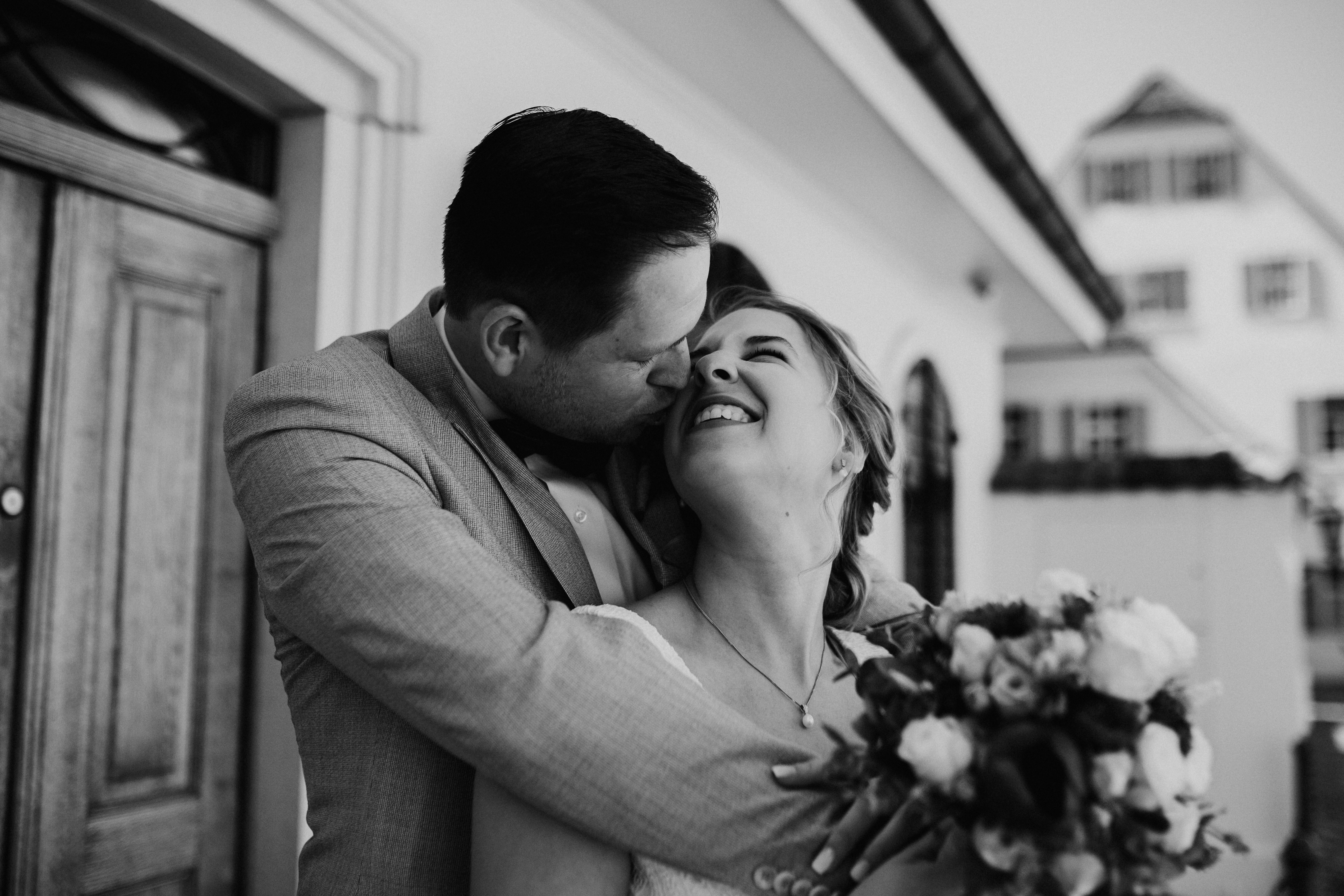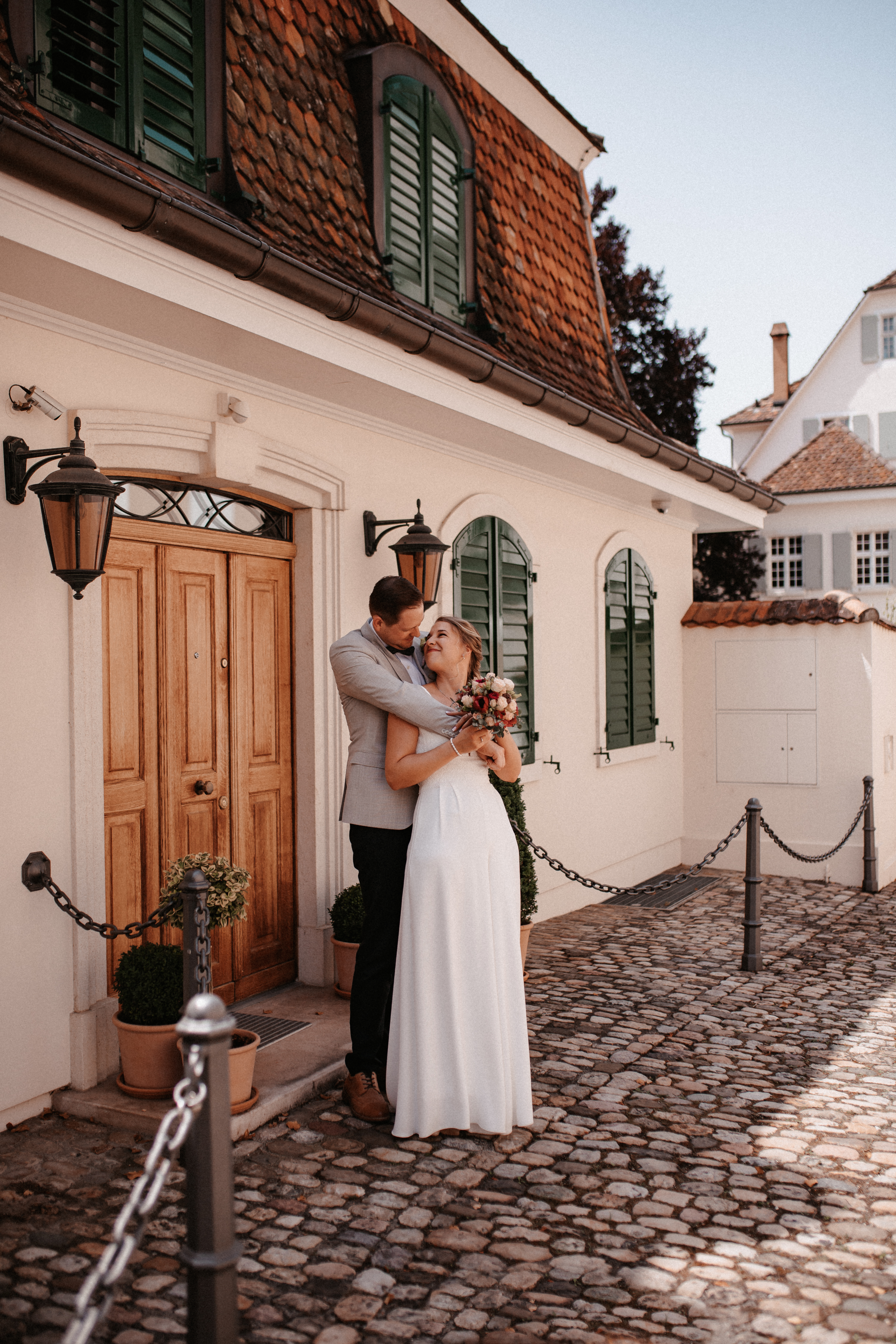 Nach dem Kennenlerngespräch mit Rebecca & Roman war ich super fröhlich – die Chemie zwischen Brautpaar und Fotografin passte absolut und ich hatte das Gefühl sie vertrauten mir in allen Punkten. Dies bestätigte sich dann auch an ihrer standesamtlichen Hochzeit. Wir hatten viel Spaß, die Stimmung war liebevoll und entspannt. Das Wetter spielte perfekt mit, auch wenn es vielleicht ein bisschen zu heiss war. Dennoch – wenn ich jetzt im Nachhinein mit dem vielen Regen darauf zurückblicke, bin ich auch mit heissen Temperaturen mehr als happy. Nach der zivilen Trauung gab es draußen eine kleine Überraschung und es wurde mit feinem ‚Guggelhopf‘, Sekt und Bier auf die Liebe der beiden angestoßen.
