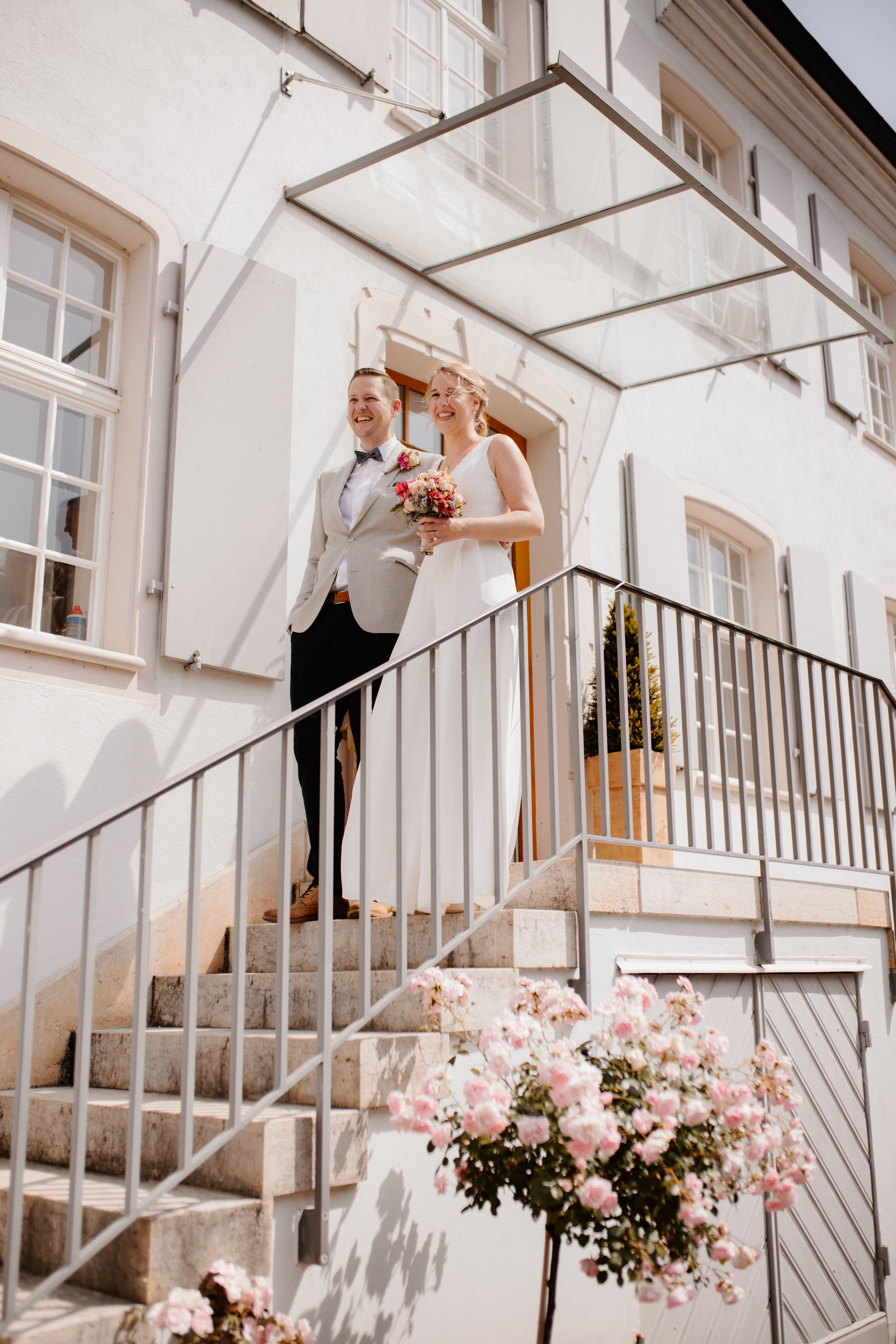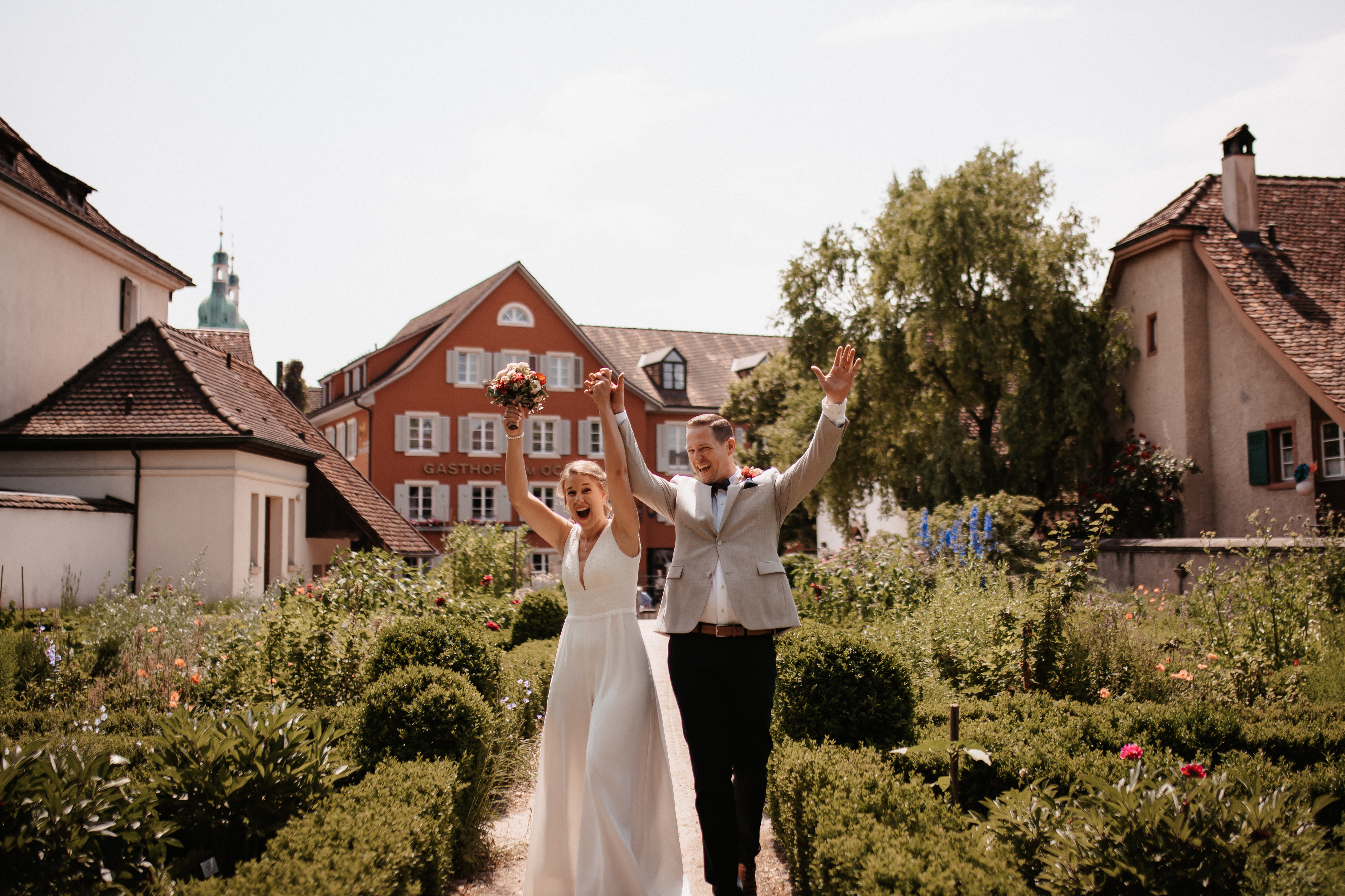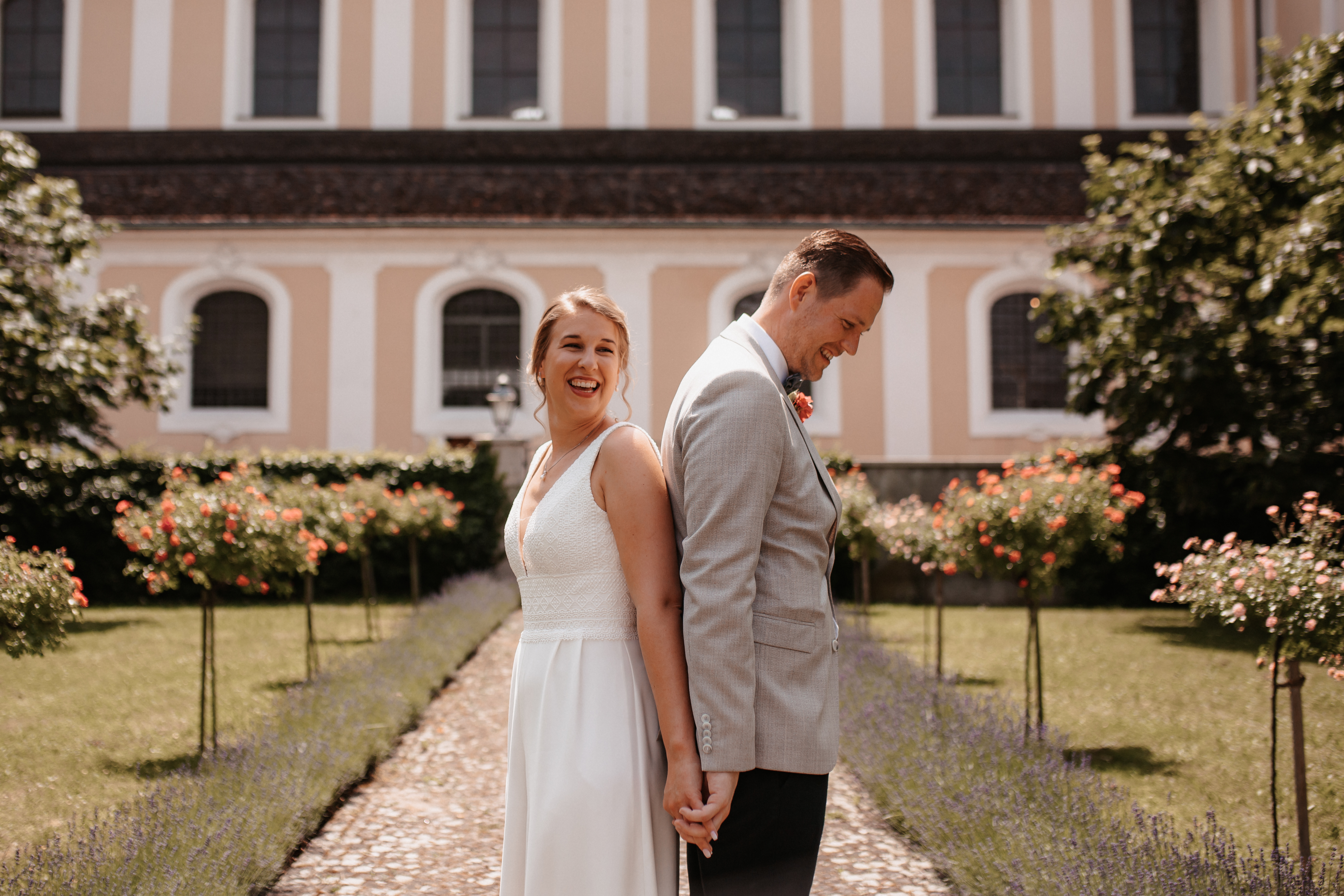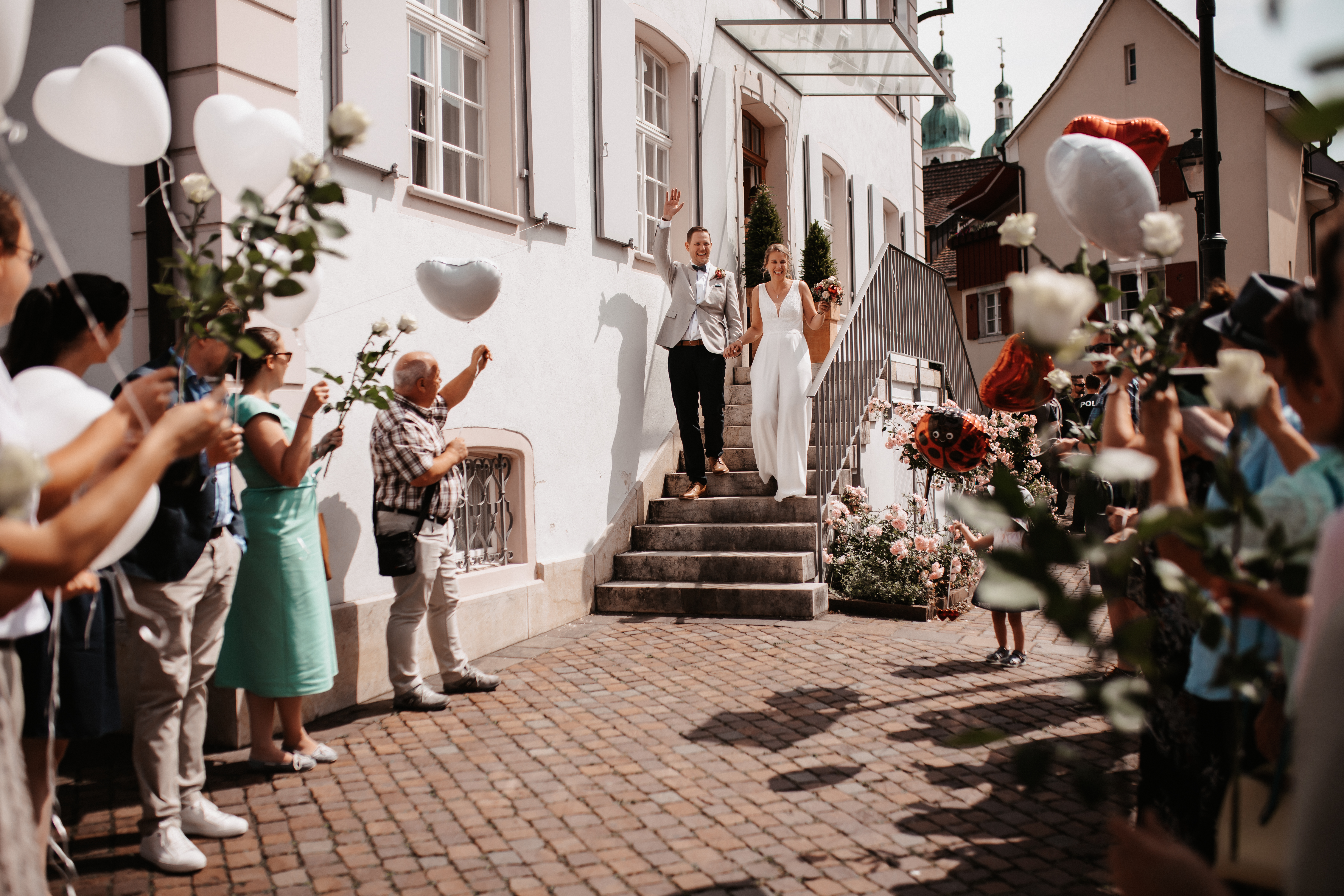 Nach dem Kennenlerngespräch mit Rebecca & Roman war ich super fröhlich – die Chemie zwischen Brautpaar und Fotografin passte absolut und ich hatte das Gefühl sie vertrauten mir in allen Punkten. Dies bestätigte sich dann auch an ihrer standesamtlichen Hochzeit. Wir hatten viel Spaß, die Stimmung war liebevoll und entspannt. Das Wetter spielte perfekt mit, auch wenn es vielleicht ein bisschen zu heiss war. Dennoch – wenn ich jetzt im Nachhinein mit dem vielen Regen darauf zurückblicke, bin ich auch mit heissen Temperaturen mehr als happy. Nach der zivilen Trauung gab es draußen eine kleine Überraschung und es wurde mit feinem ‚Guggelhopf‘, Sekt und Bier auf die Liebe der beiden angestoßen.