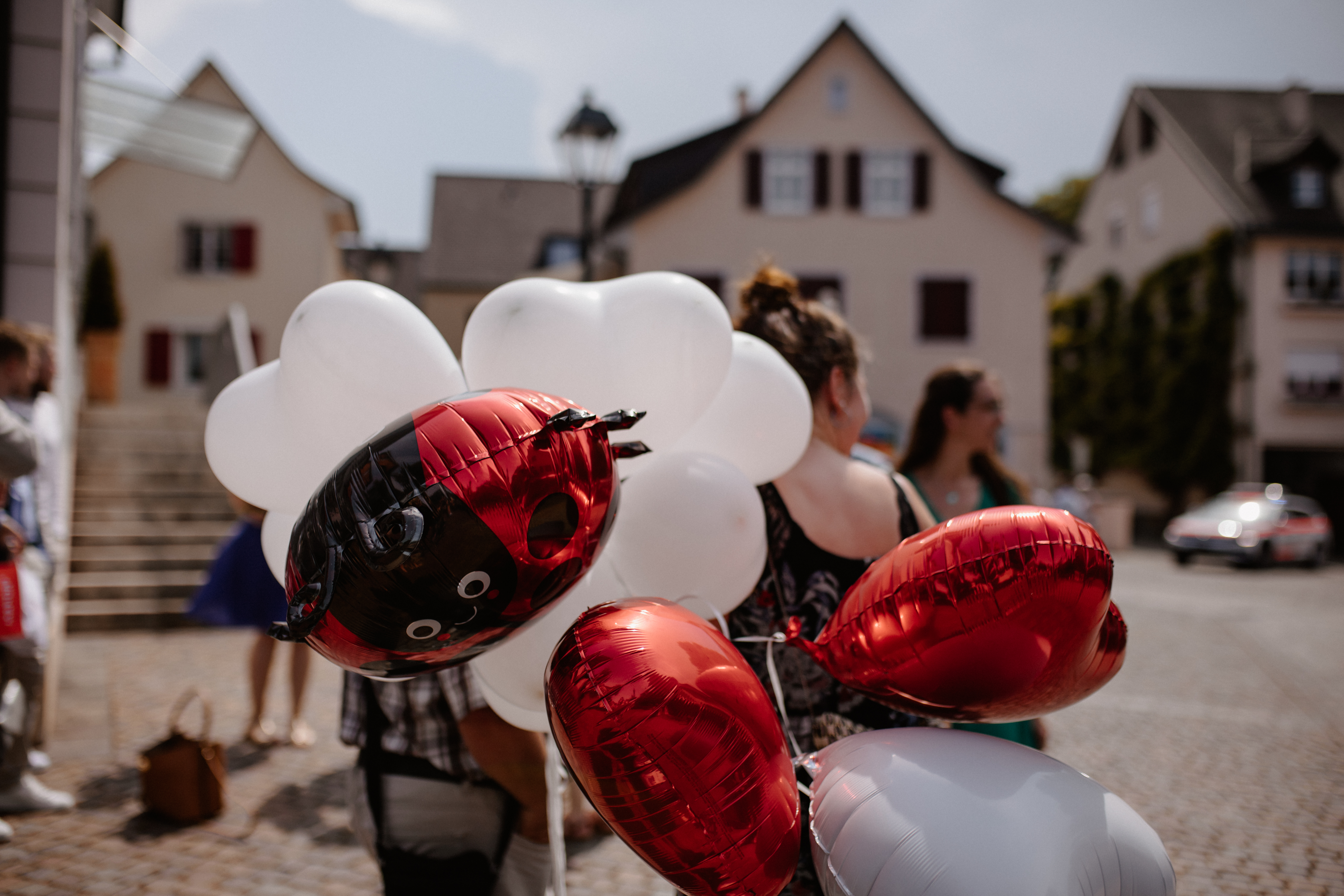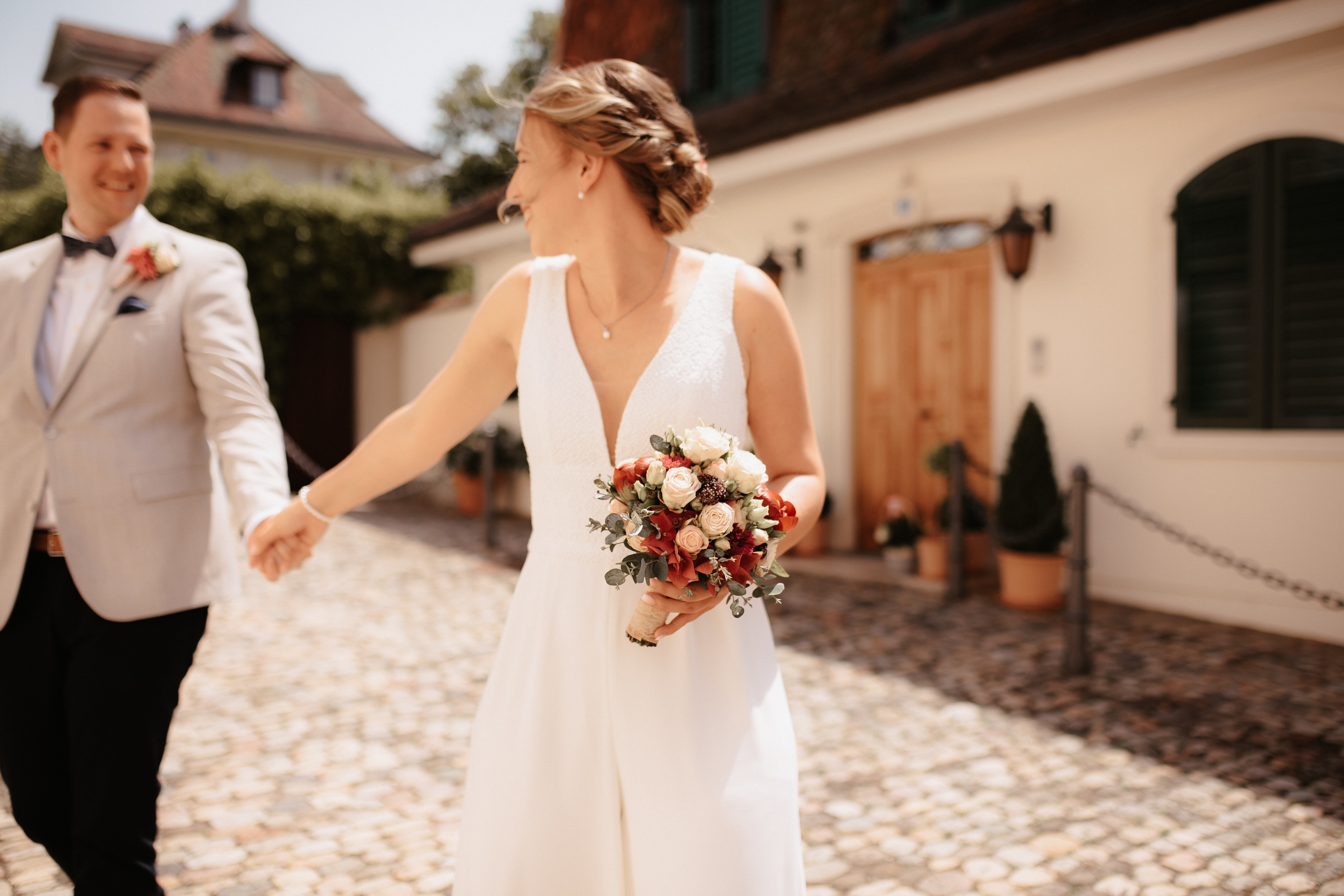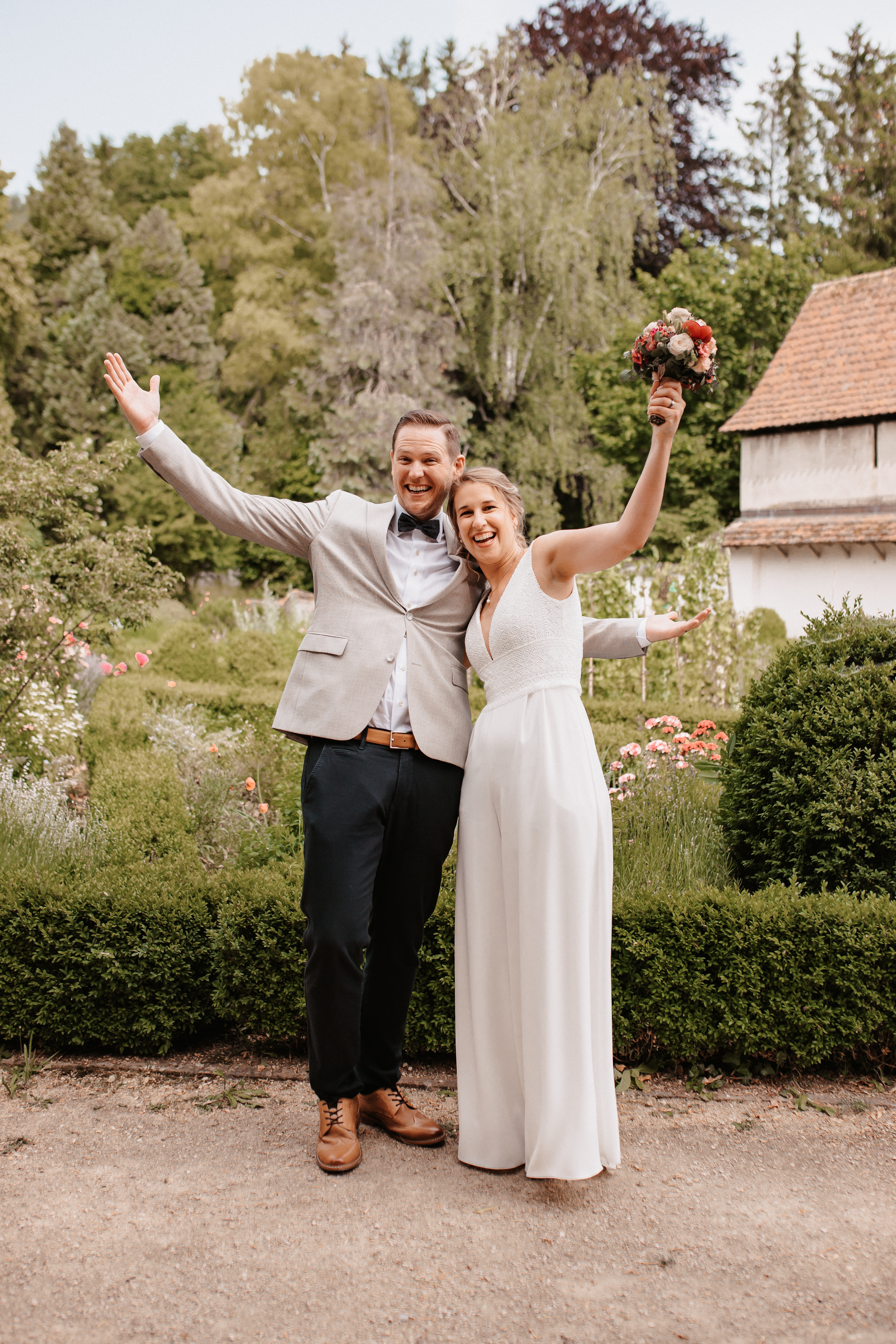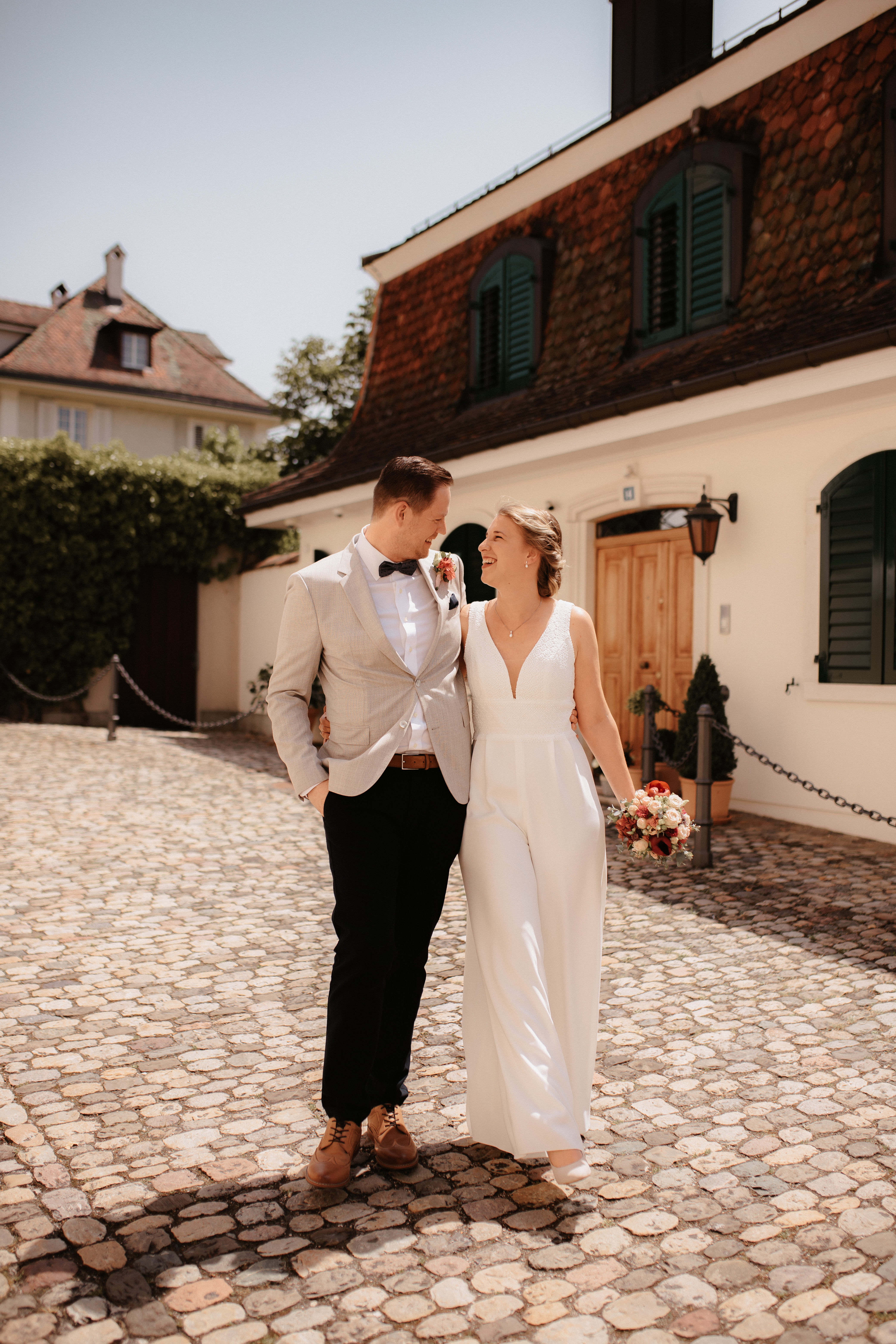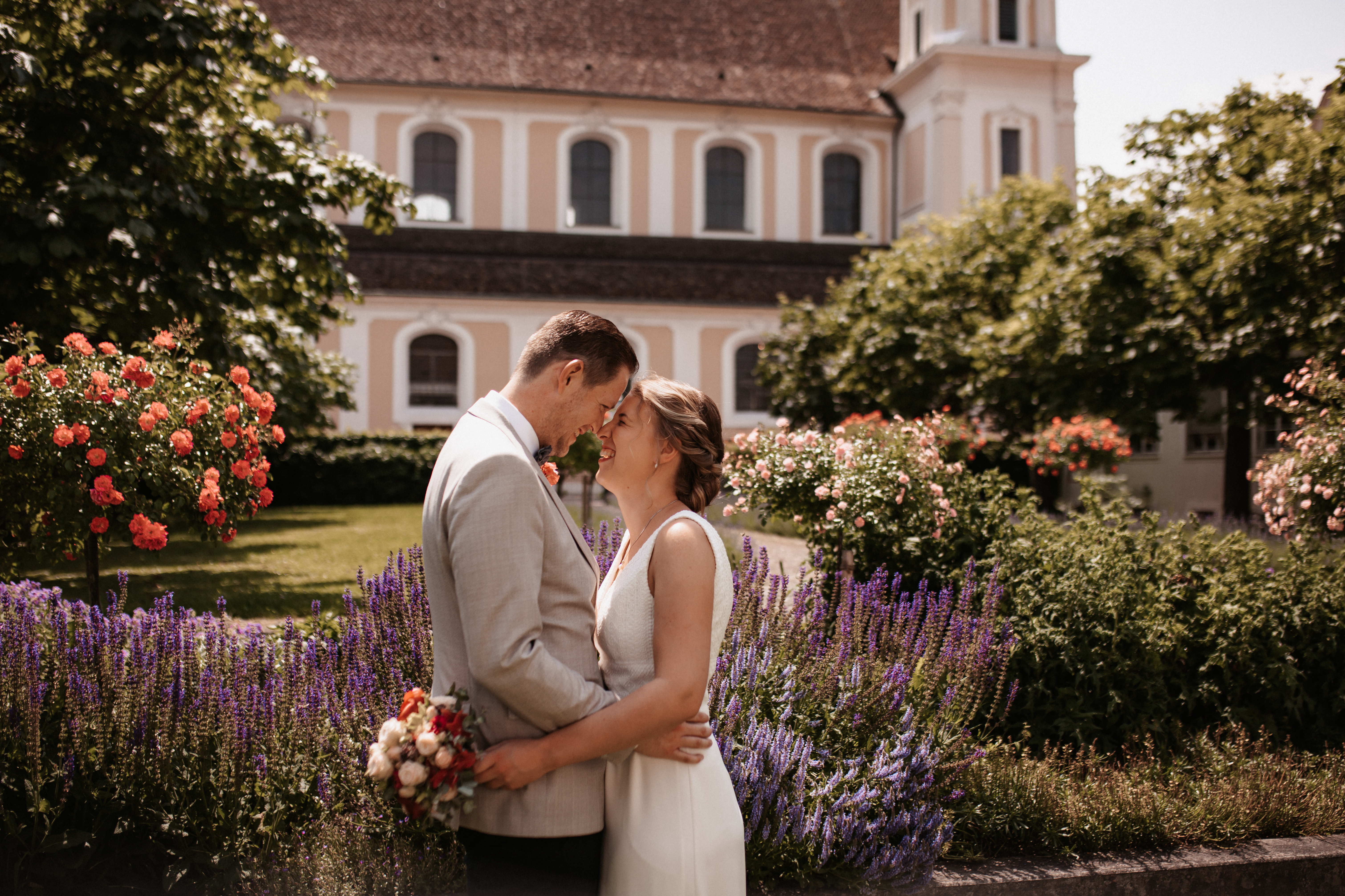 Nach dem Kennenlerngespräch mit Rebecca & Roman war ich super fröhlich – die Chemie zwischen Brautpaar und Fotografin passte absolut und ich hatte das Gefühl sie vertrauten mir in allen Punkten. Dies bestätigte sich dann auch an ihrer standesamtlichen Hochzeit. Wir hatten viel Spaß, die Stimmung war liebevoll und entspannt. Das Wetter spielte perfekt mit, auch wenn es vielleicht ein bisschen zu heiss war. Dennoch – wenn ich jetzt im Nachhinein mit dem vielen Regen darauf zurückblicke, bin ich auch mit heissen Temperaturen mehr als happy. Nach der zivilen Trauung gab es draußen eine kleine Überraschung und es wurde mit feinem ‚Guggelhopf‘, Sekt und Bier auf die Liebe der beiden angestoßen.
